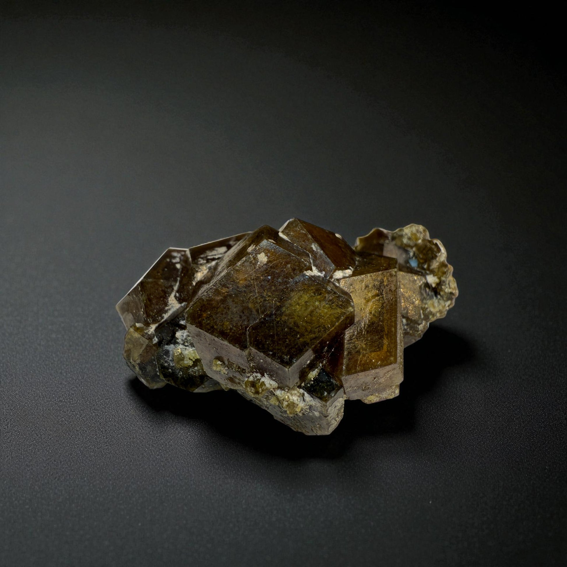 A richly colored andradite garnet featuring reflective crystals with deep olive-bronze shading.