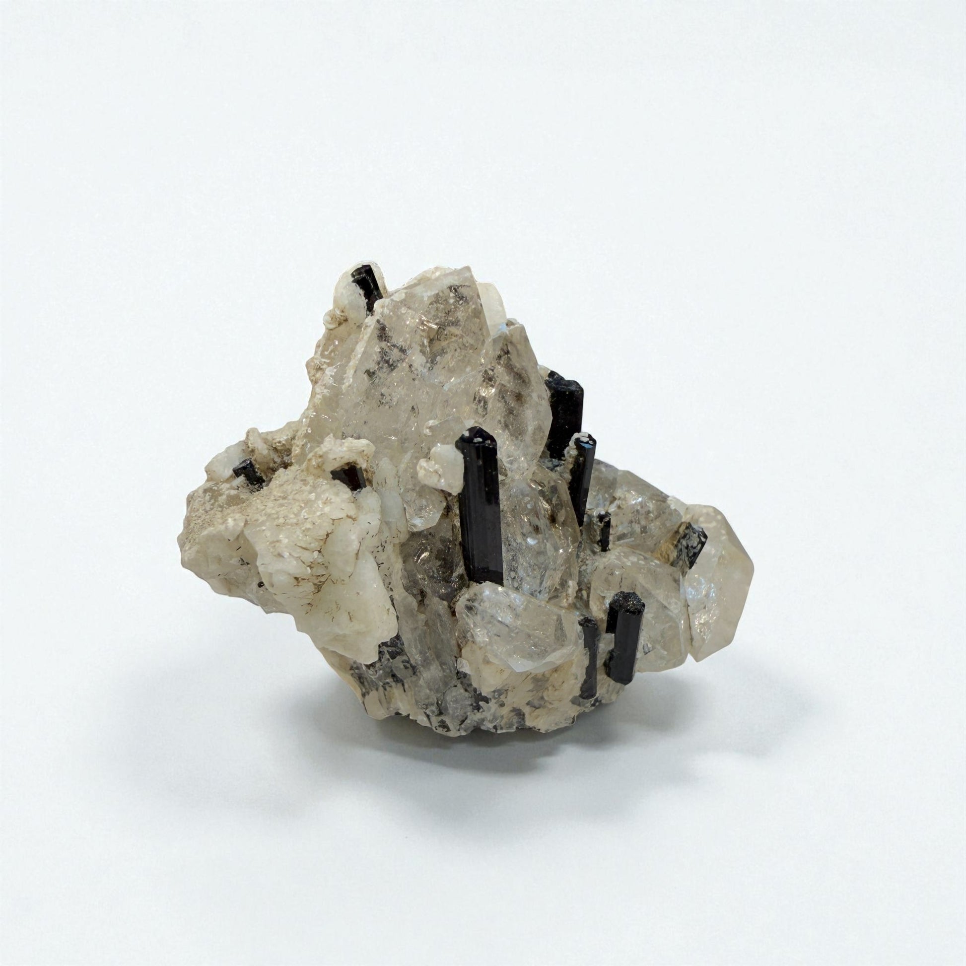 Multiple slender tourmaline crystals embedded in transparent quartz create a dramatic, architectural form. Natural symmetry and clarity make this piece a collector’s favorite.