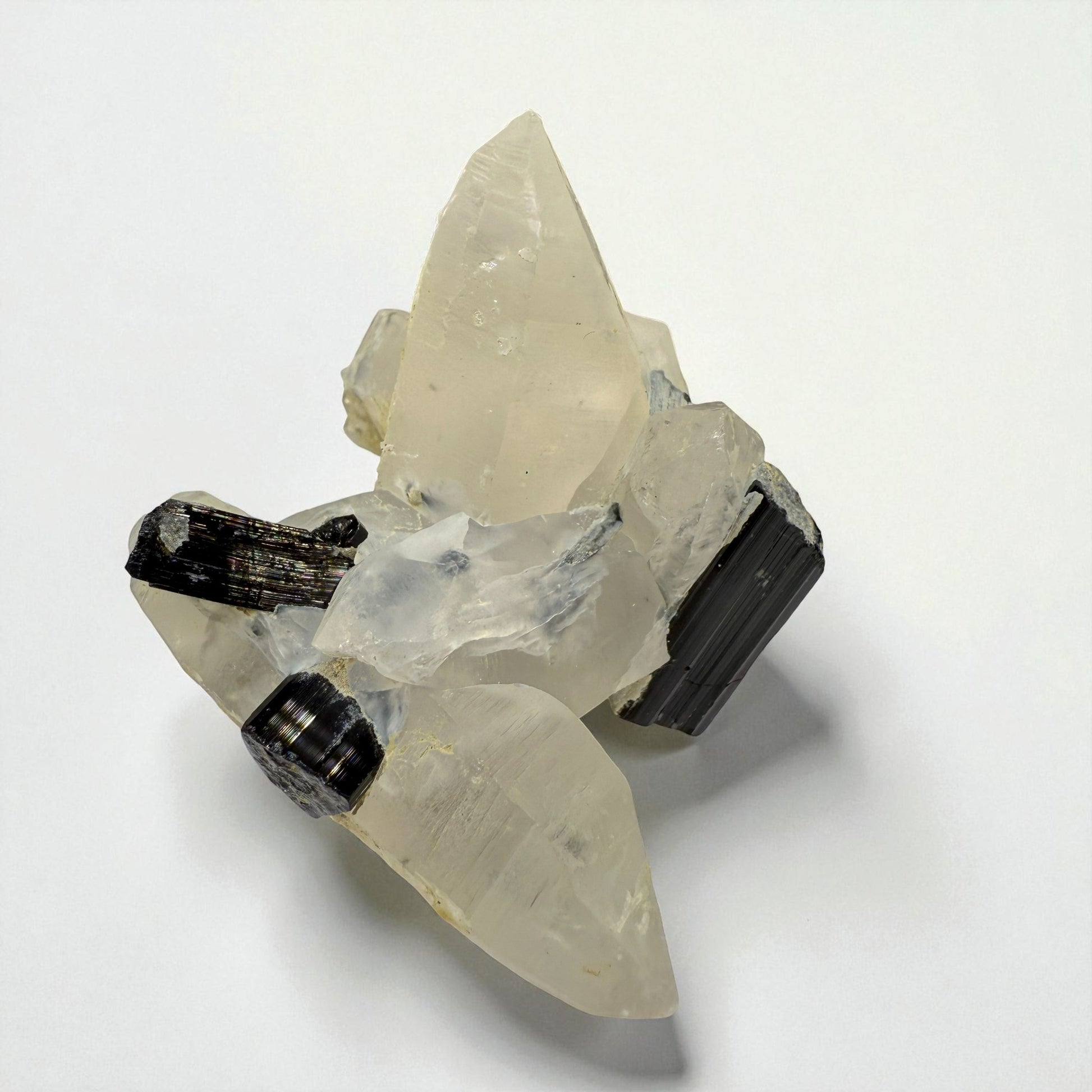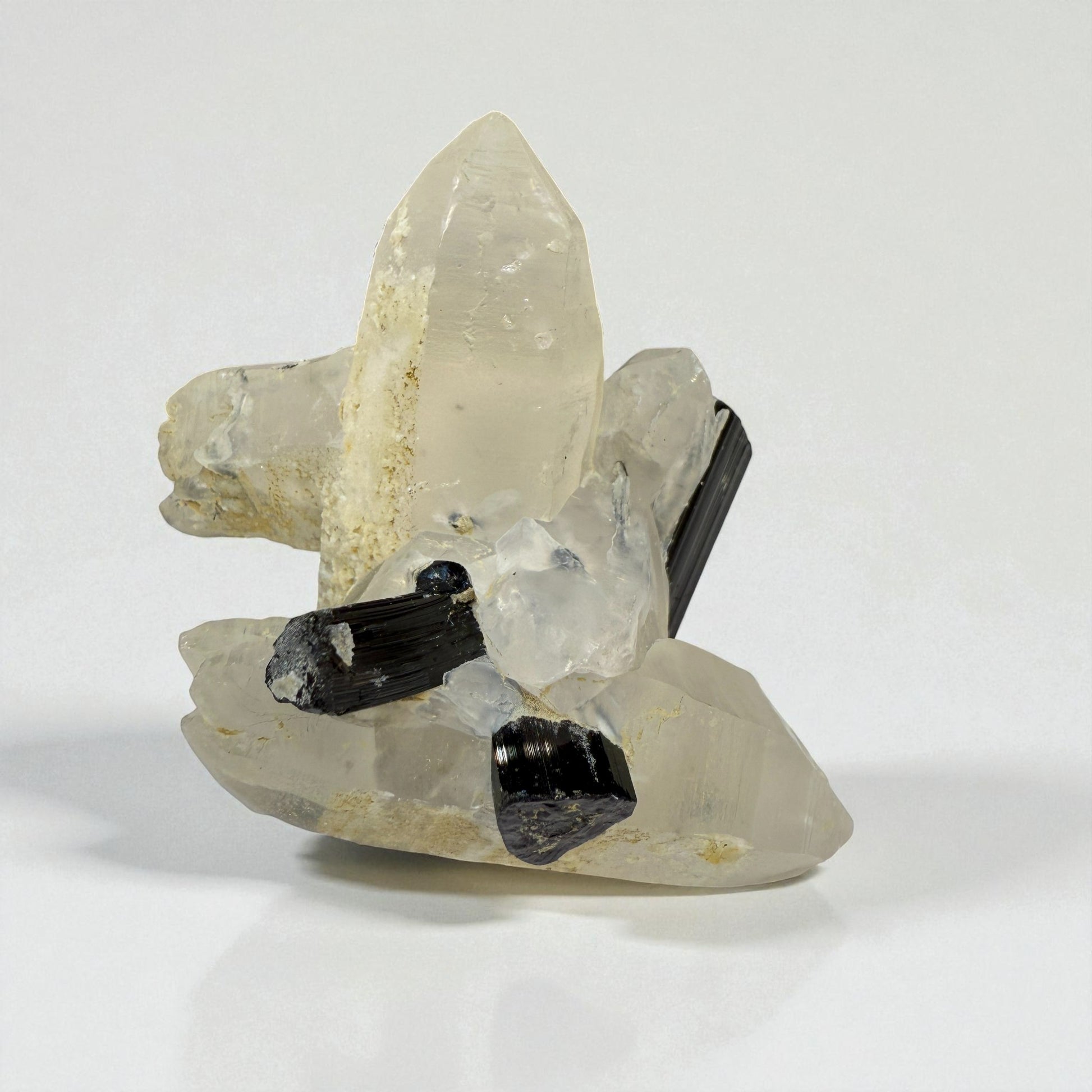 This elegant tourmaline and quartz association shows the natural harmony between two iconic pegmatite minerals. The tourmaline crystals are embedded within clear quartz growth, producing a vivid contrast of texture and tone. Originating from Pakistan’s Gilgit-Baltistan mountains, these specimens are admired for their balance, mineral contrast, and refined display quality — ideal for collectors seeking naturally sculpted crystal formations.