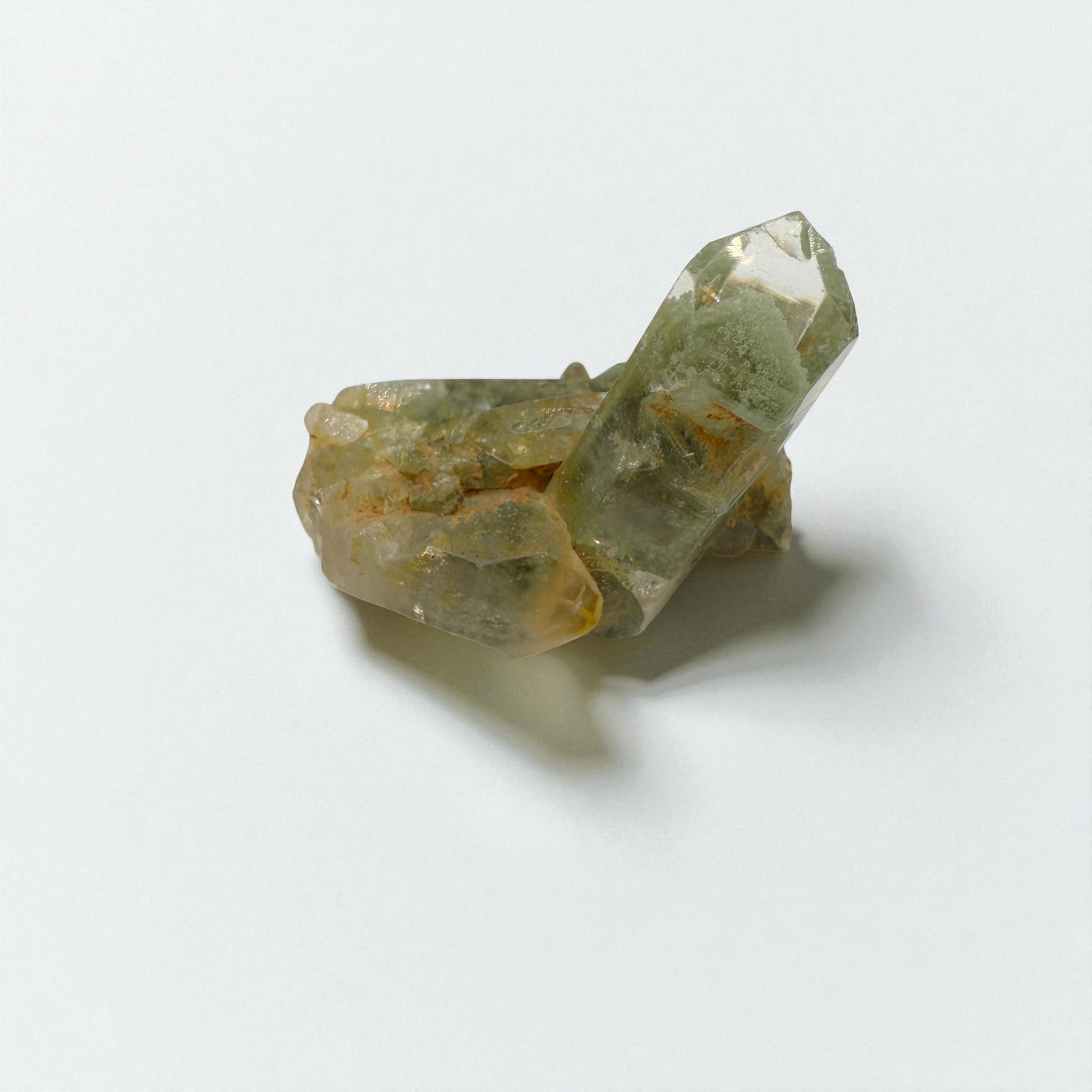 A compact quartz crystal with soft green chlorite veils suspended inside. Its clarity reveals the mineral’s natural growth zones, giving a serene, mist-like appearance. Perfect miniature for collectors of inclusion quartz.
