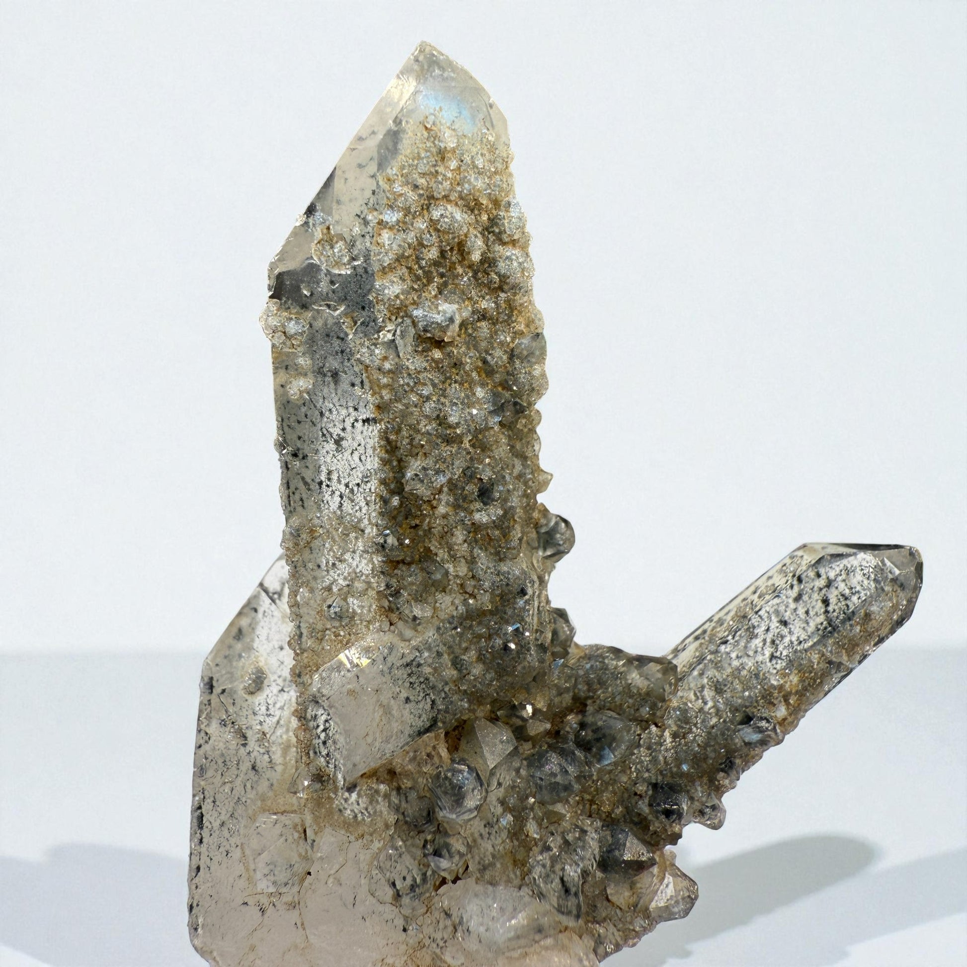 A highly aesthetic Chlorite Quartz with distinct green inclusions distributed through its base and interior. The elongated crystals feature clear terminations and subtle internal misting from chlorite growth. The reflective upper faces create a luminous effect under light.