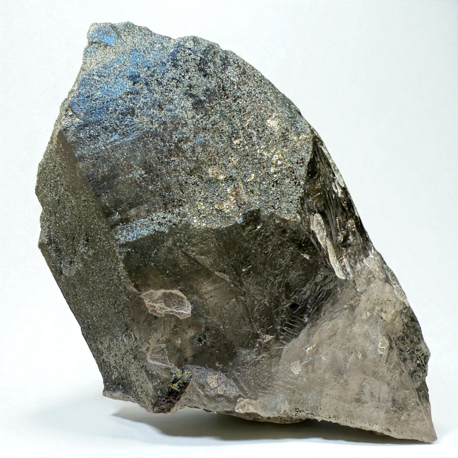 This natural Chlorite Quartz crystal displays a fine green coating of chlorite over its surface, giving it a velvety, reflective texture. The crystal preserves its original quartz form while showing deep mineral character. Each piece is completely natural and hand-selected for its rich surface detail, balance, and distinctive alpine-style appearance — a perfect addition to any collector’s quartz series.