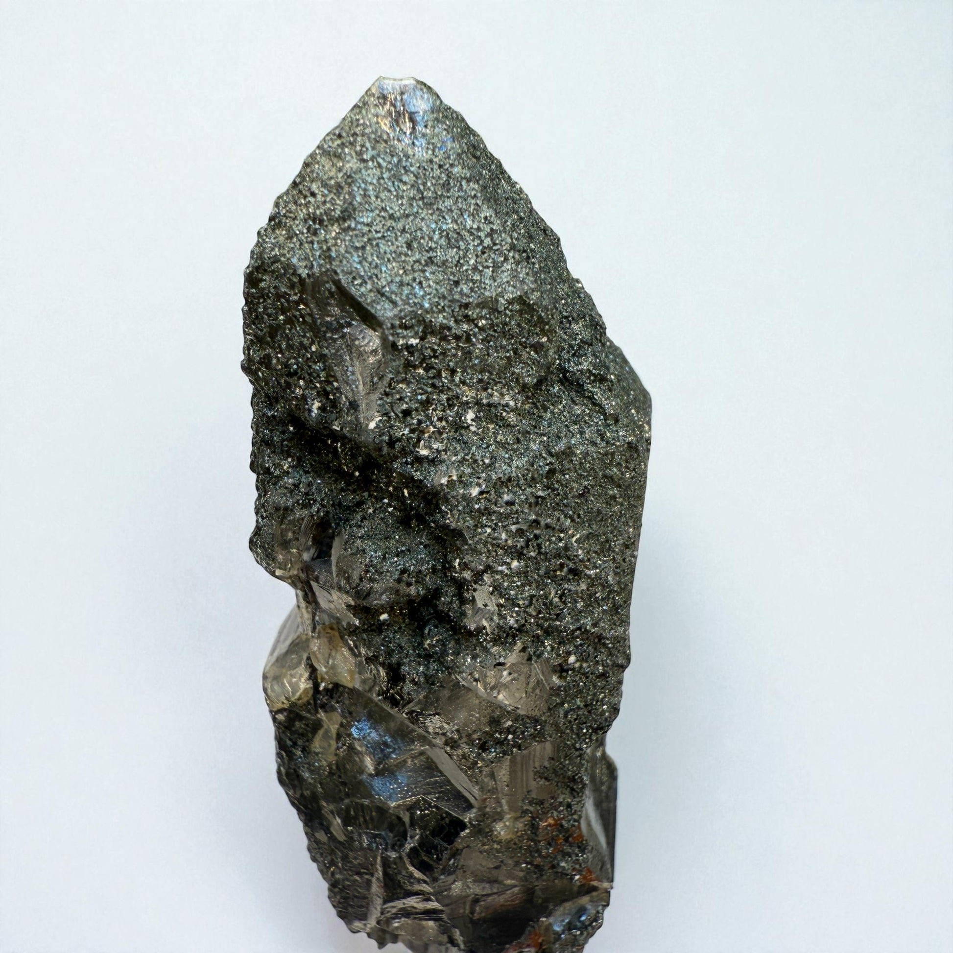 This aesthetic Chlorite Quartz from the Gilgit-Baltistan region of northern Pakistan showcases deep green chlorite inclusions that give the crystal a soft metallic sheen. The coating enhances the natural form of the quartz and adds a layered, mineral-rich character. A classic example of chlorite mineralization from one of the world’s most scenic mountain deposits.