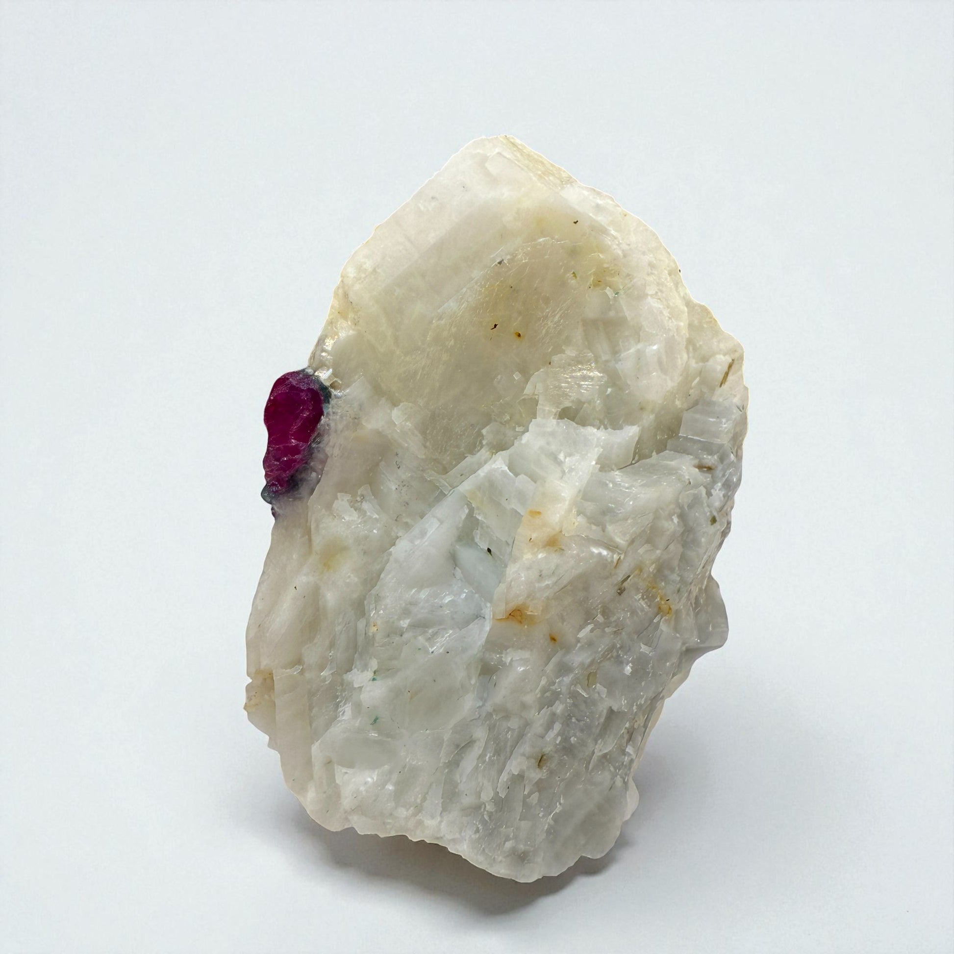 A luminous ruby crystal from Hunza Valley, Pakistan, known for glowing crimson under UV light. Set in white marble, it embodies elegance and natural formation. Small but exceptional, it’s part of a limited deposit of fluorescent rubies from this iconic region. A stunning collector’s gemstone with lasting appeal.