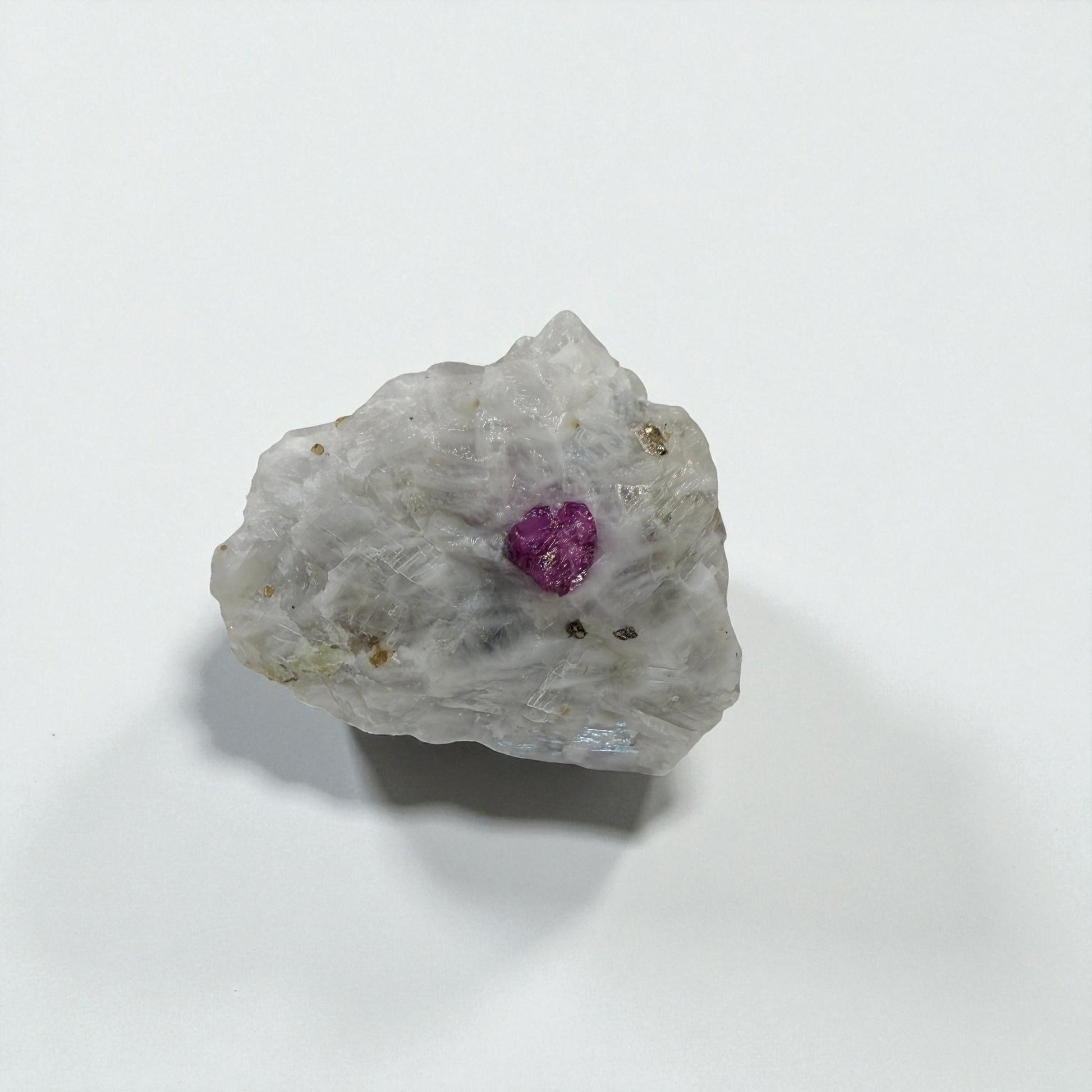 A petite yet powerful fluorescent ruby in white marble matrix from Hunza Valley. The crystal shines vivid red under ultraviolet light — a captivating display of its natural chromium chemistry. Rubies from this mountain region are rare and prized by collectors for their glow and clarity. A gem of both scientific interest and aesthetic charm.