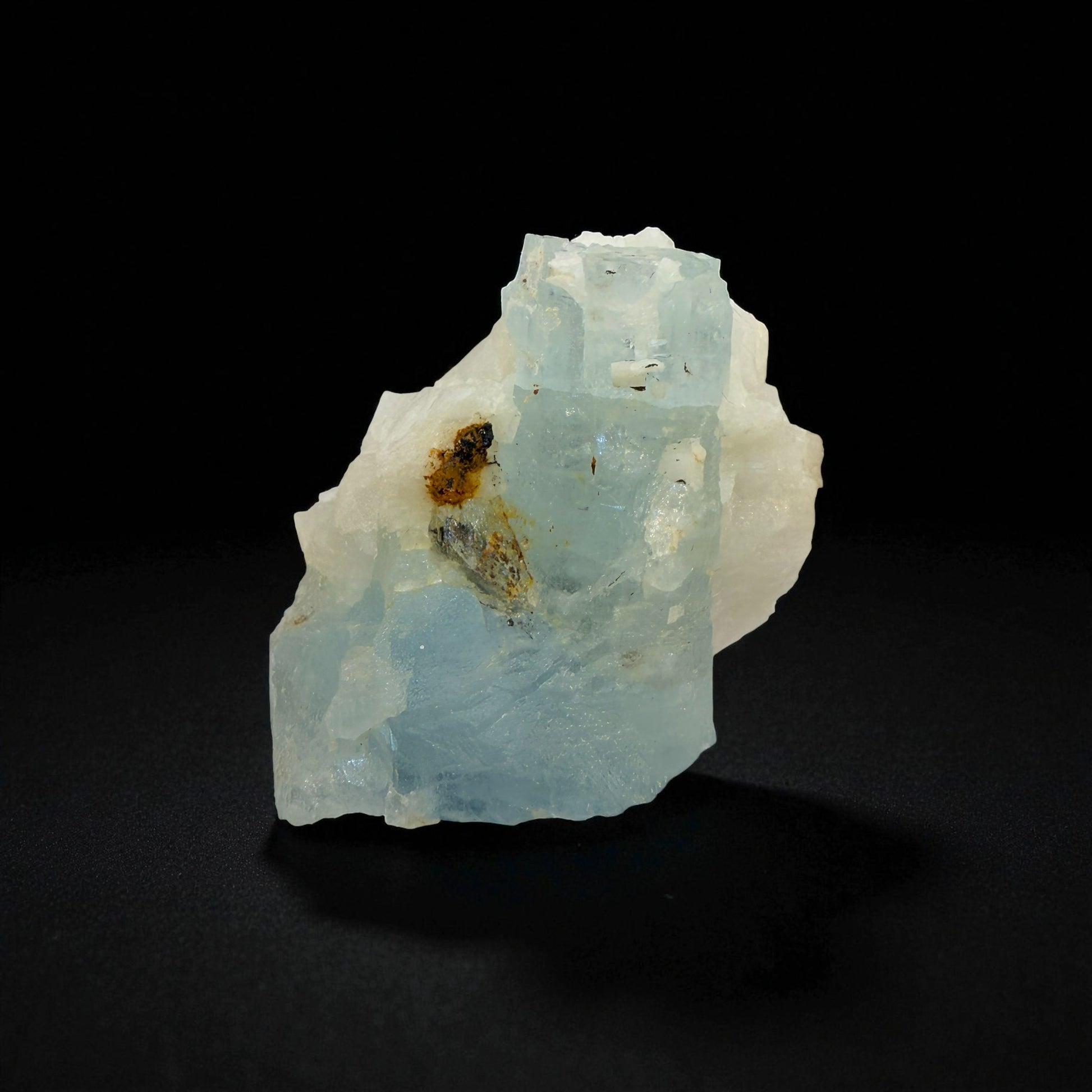Aquamarine crystal from Nagar, Gilgit-Baltistan, Pakistan — a natural water etched beryl specimen distinguished by its icy blue clarity and fine prism structure. Gentle hints of iron inclusions create subtle warmth without reducing brilliance. The contrast of pale blue and white, under directional light, produces a luminous glow prized by collectors.